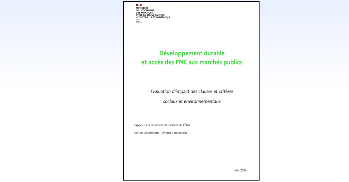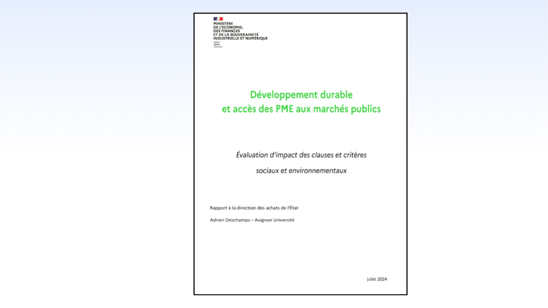 Au début de l'année 2024, la direction des Achats de l’Etat (DAE) a publié une étude économique sur l’impact des politiques d’achat public responsable sur les PME rédigée par Adrien Deschamps, doctorant en économie à Avignon Université. Cette étude intitulée "Développement durable et accès des PME aux marchés publics" explore l'intégration des critères de développement durable dans les marchés publics en France et analyse leur impact sur l'accès des petites et moyennes entreprises (PME) à ces marchés.