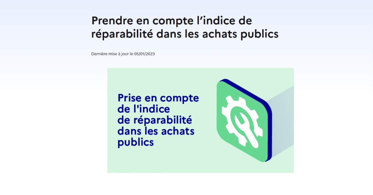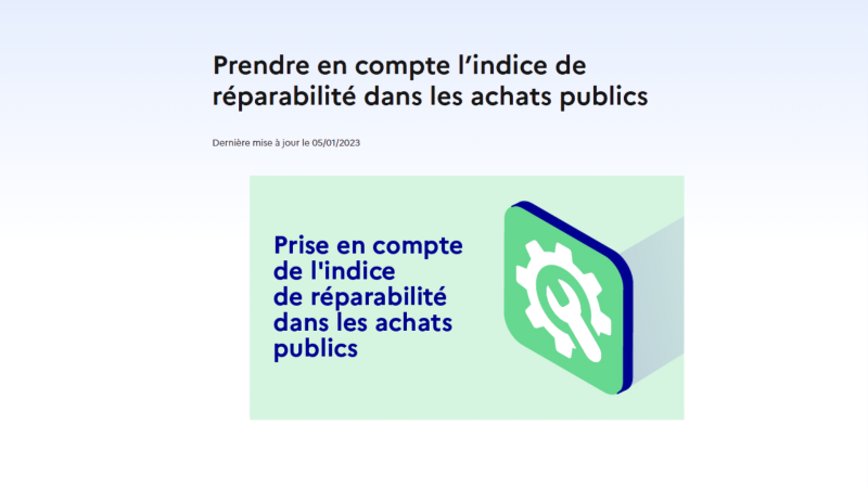 "La prise en compte de l’indice de réparabilité dans les achats publics" est un guide pédagogique, publié par le Ministère de la transition écologique et de la cohésion des territoires en 2022 afin d’aider les acheteurs de l’Etat, des collectivités territoriales et de leurs groupements à prendre en compte l’indice de réparabilité lors de l’achat de produits numériques disposant d’un tel indice. Cette obligation a été créée par l’article 15 de la loi du 15 novembre 2021 visant à réduire l’empreinte environnementale du numérique.