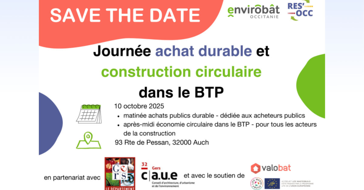 Rendez-vous pour la première journée achat durable et économie circulaire dans le BTP organisée par le Conseil départemental du Gers, le CAUE du Gers, RES’OCC et Envirobat Occitanie.
