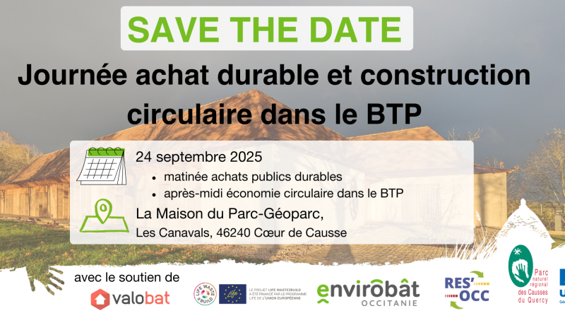 Rendez-vous pour la première journée achat durable et économie circulaire dans le BTP organisée par le Parc Naturel Régional des Causses du Quercy, RES’OCC et Envirobat Occitanie.