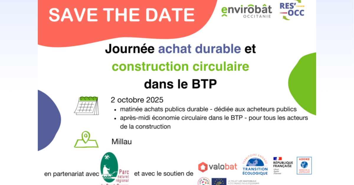 Rendez-vous pour la première journée achat durable et économie circulaire dans le BTP organisée par RES’OCC, Envirobat Occitanie et le Parc Naturel Régional des Grands Causses.