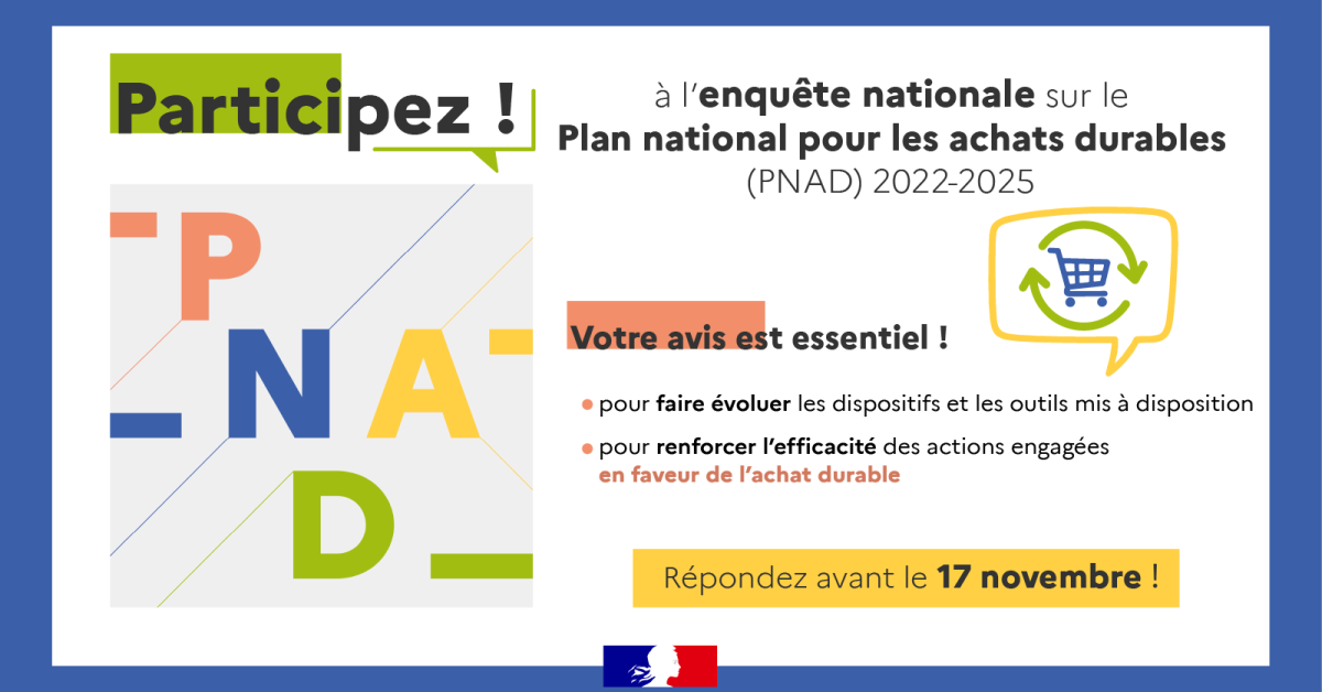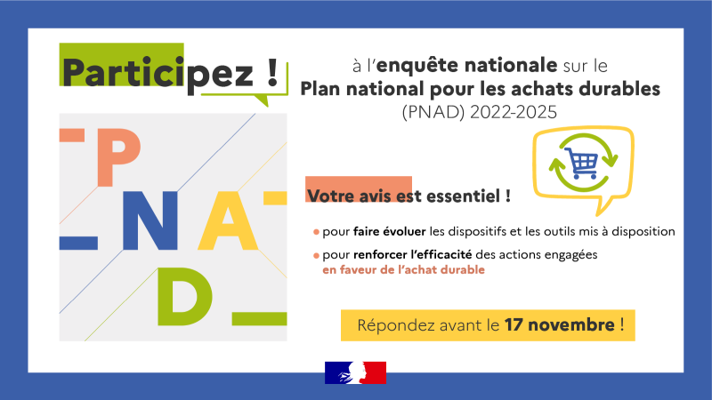 Le ministère de la Transition écologique et l’ensemble de ses partenaires vous sollicitent pour les aider à réaliser le bilan des politiques menées en faveur des achats durables depuis 2022, et dont la feuille de route se traduit par le Plan national pour des achats durables (PNAD) 2022-2025.