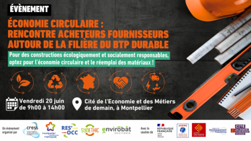 La CRESS Occitanie, la Métropole de Montpellier, RES’OCC, Synethic et Envirobat Occitanie s’associent pour co-organiser une rencontre Acheteurs/Fournisseurs, avec le soutien de l’État, la Région Occitanie, l’ADEME, l'Agence de développement et des transitions et la Cité de l’Économie et des Métiers de demain.