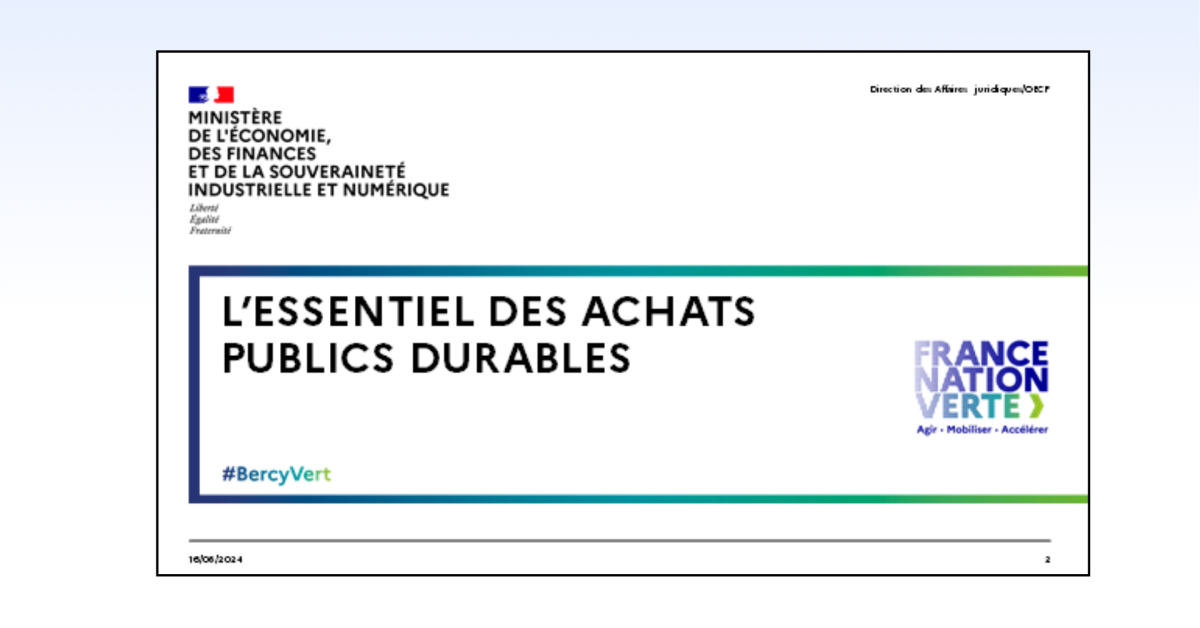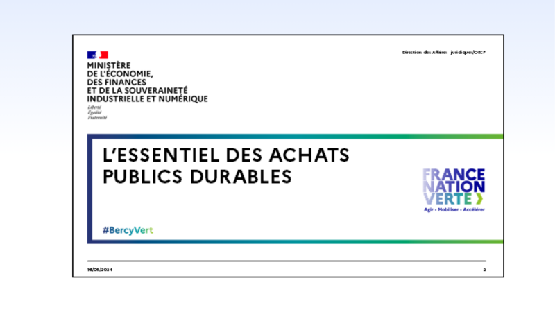 La fiche sur l'essentiel des achats publics durables a été publiée par la direction des Affaires juridiques (DAJ) du ministère de l'Économie, des Finances et de la Souveraineté industrielle et numérique en mai 2023. Elle vise à fournir un cadre juridique et pratique pour intégrer des pratiques durables dans tous les types d'achats publics.
