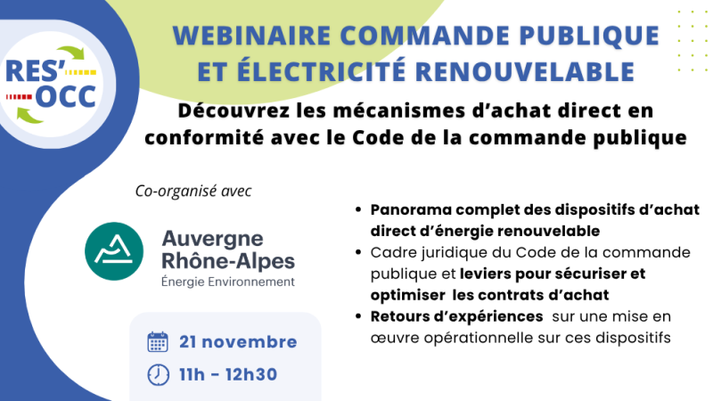Ce webinaire, co-organisé par Auvergne-Rhône-Alpes Énergie Environnement (AURA-EE) et le réseau des Achats Responsables en Occitanie (RES'OCC), fournira aux acheteurs publics un panorama complet des dispositifs d’achat direct d’énergie renouvelable (PPA, autoconsommation, marchés spécifiques), des contraintes juridiques du Code de la commande publique et des leviers pour sécuriser et optimiser leurs contrats.